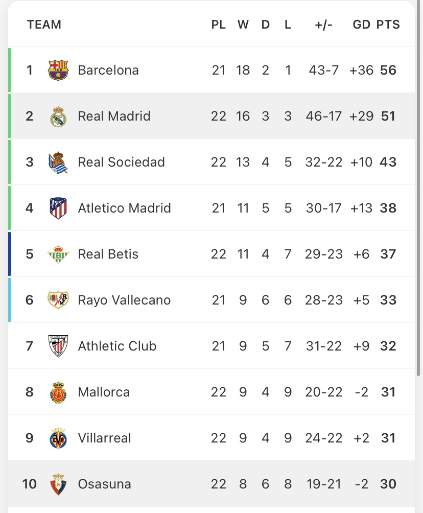 西甲第30轮比赛赛程及排名